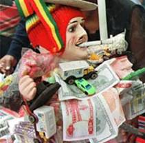 毎年1月下旬にラパスで行なわれる行事で、自分がその年の幸福を手にすることを願ってエケコと呼ばれる人形に託します。方法は簡単、縁日で自分がほしいもののミニチュアを買ってその人形にぶら下げるのです。お札から車、庭つきの家、食材や卒業証書まで。それらを求めるラパス市民で縁日は大混雑しますが、人々は真剣にそのミニチュアを選びます。もともとアイマラの女性が多産を祈って身につけたというイケコ人形。伝統とかけ離れても、現在に至るまで息づいている先住民の文化には目を見張るものがあります。 |