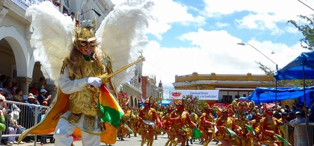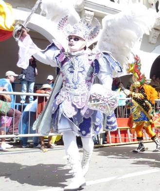 「ディアブラーダ」は、南米の三大カーニバルのひとつでもある「オルーロのカーニバル」のシンボルとも言える踊りで、1904年に誕生しました。「ディアブロ」は悪魔を意味しますが、ここでいう悪魔が象徴するのは、「スーパイ」または「ワリ」の名で知られるアンデスの山の神であり、同時にキリスト教にとっての悪魔サターンでもあります。「ディアブラーダ」の踊りには、キリスト教の大天使サン・ミゲルと、悪魔サターンとされる「ディアブロ」が相対するものとして登場しますが、そこには二つの世界観を読み取ることができます。ディアブラーダの舞台では、7人のディアブロがキリスト教の七つの大罪を表し、それを征する大天使が彼らを従えます。アンデスの民にとってそれは、自由を求める鉱夫たちの抵抗を、大天使、つまり支配者に抵抗する悪魔の踊りとして描き、侵略者スペインを風刺したものと理解されています。現代、カーニバルで踊られる「ディアブラーダ」では、たくさんの男女が悪魔に扮し、1ブロックに一人の大天使が配置されます。男女ともに奇抜なデザインの「ディアブロ」の面や、色鮮やかな衣装が観衆の目を惹く踊りです。 〔参考文献〕 Campos Iglesias, Celestino, Musica, danza e instrumentos folkluricos de Bolivia, 2005, La Paz: Producciones CIMA. http://www.turismobolivia.bo/loader_es.php?n1=3&n2=4&n3=&n4= この文章はUmezaki Kahoriさんに寄稿していただきました。 |