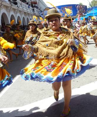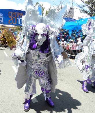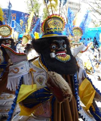 「モレーノ」とはスペイン語で「褐色の肌の人」を意味します。このモレーノたちが踊る「モレナーダ」は、植民地時代初期にボリビアの銀山に導入された黒人奴隷の姿をモチーフに、彼らがオルーロやポトシといった当時の鉱山都市へ連行される際の苦渋に満ちた行進を描いた踊りとして広く知られています。スペインによる植民地化と搾取の中心であった鉱山地帯で生まれたとされるこの踊りには、奴隷の姿を真似ること裕福な階層の人々への風刺が込められているとも言われます。モレナーダの特徴でもある重厚で豪華絢爛な衣装は、奴隷ではなく奴隷主の財力を表し、仮面の飛び出した目やだらりと出した舌は、アフリカからの黒人奴隷が慣れない高地で高山病に苦しみ、疲労にあえぐ姿を表現しています。また、この踊りでは、奴隷の足に繋がれた鎖の音を「マトラカ」という楽器で再現し、彼らの重い足どりを、また時には鎖を引きずりよろめき倒れる様子を演出していると考えられています。 〔参考文献〕 Campos Iglesias, Celestino, Musica, danza e instrumentos folkluricos de Bolivia, 2005, La Paz: Producciones CIMA. http://www.turismobolivia.bo/loader_es.php?n1=3&n2=4&n3=&n4= この文章はUmezaki Kahoriさんに寄稿していただきました。 |