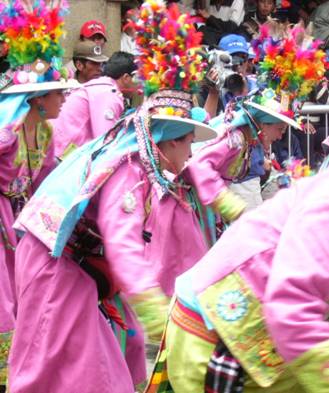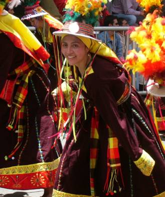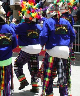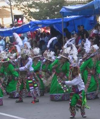 ボリビアのポトシ県北ポトシ地方に「ティンク」という祭儀があります。「ティンク」とはケチュア語で「出会い」を意味し、隣り合う村同士が年に一度寄り集まり喧嘩をする祭りとして知られています。発祥は遥か昔にさかのぼると言われるこの祭りは、村の男たちが力を競い合う喧嘩祭りである一方で、男女の出会いの場でもありました。もとは領地争いとの説も、また民が信仰する母なる大地「パチャママ」への献身の儀式であるとの説もありますが、この祭りで大地に流された血が、翌年の豊作をもたらすと信じられています。この祭りをモチーフにしたのが「ティンク」の踊りで、ポトシから広まったとされるこの踊りは、現代ではボリビアの各地方で踊られるようになりました。衣装は北ポトシ地方の民族衣装が原型となった色鮮やかなもので、男性が動物の皮で作ったヘルメットを被るのが特徴的です。振り付けには喧嘩の形と思われる動作も取り入れられ、喧嘩が始まりどちらかが倒れるまでをひとつのストーリーとして組み立てた演出も多く見られます。 〔参考文献〕 Campos Iglesias, Celestino, Musica, danza e instrumentos folkluricos de Bolivia, 2005, La Paz: Producciones CIMA. http://www.turismobolivia.bo/loader_es.php?n1=3&n2=4&n3=&n4= この文章はUmezaki Kahoriさんに寄稿していただきました。 |